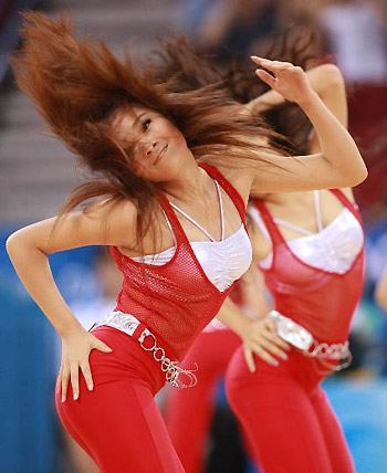 Cheerleaders perform during the Group B opener of the Beijing Olympic women's basketball event on August 9, 2008.[www.sina.com]