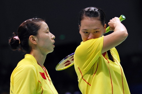 China's Yang Wei (L) and Zhang Jiewen react after a missing point against Japan's Miyuki Maeda (R) and Satoko Suetsuna during their women's doubles quarter-final badminton match for the 2008 Beijing Olympic Games at the Beijing University of Technology Gymnasium on August 11, 2008.[Agencies]