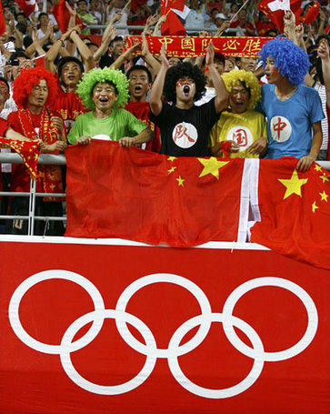 Chinese fans cheer before their men's first round Group C soccer match against Belgium at the Beijing 2008 Olympic Games in Shenyang August 10, 2008.[Agencies]