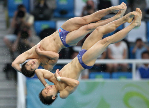Lin Yue and Huo Liang of China compete in the men's 10m platform synchronized diving final at the National Aquatics Center during the Beijing 2008 Olympic Games August 11, 2008. The teenager pair won the gold. [Agencies]