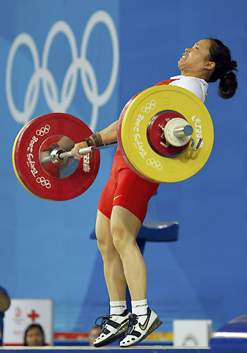 Chen Yanqing of China lifts 106kg in the women's 58kg Group A snatch weightlifting competition at the Beijing 2008 Olympic Games August 11, 2008. The Athens Olympic champion defended her title. [Agencies]