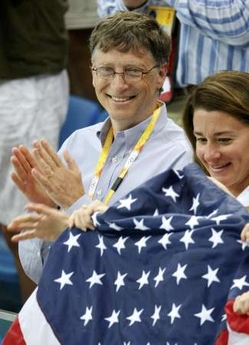 Microsoft co-founder Bill Gates (L) and his wife Melinda cheer for the U.S. swimming team at the National Aquatics Center during the Beijing 2008 Olympic Games, August 10, 2008.[Agencies]