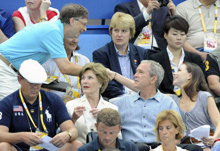 Microsoft co-founder Bill Gates shakes hands with Barbara Bush as US President George Bush (C) and first lady Laura Bush (2nd L) watch the swimming events at the National Aquatics Center during the Beijing 2008 Olympic Games, August 11, 2008.[Agencies]