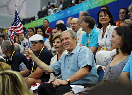 US President George W. Bush (C) waves a US flag as the First Lady Laura Bush (2nd L) and daughter Barbara (R) watch the 2008 Beijing Olympic Games men's 200m freestyle semi-finals at the National Aquatics Center in Beijing on August 11, 2008. [Agencies]