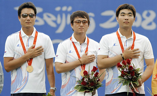 South Korean archers (L-R) Park Kyung-Mo, Lee Chang-Hwan and Im Dong-Hyun listen to their national anthem during the award ceremony in the men's team archery competition of the Beijing Olympic Games on August 11, 2008. South Korea won the gold. [Agencies]
