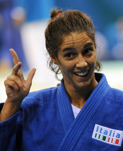 | Italy's Giulia Quintavalle celebrates after winning against France's Barbara Harel during their women's -57kg judo match of the 2008 Beijing Olympic Games on August 11, 2008 in Beijing. [Agencies] |