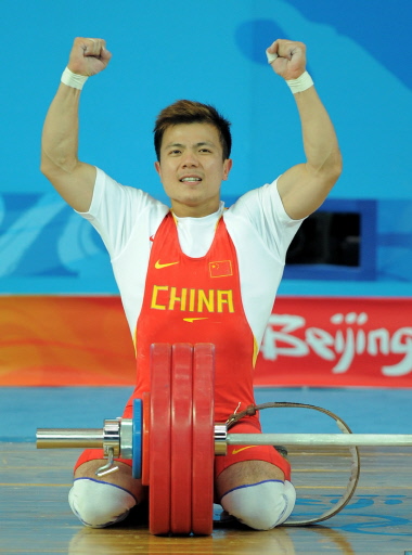 Zhang Xiangxiang of China celebrates his gold medal victory in the men's 62 kg weightlifting event during the 2008 Beijing Olympic Games at the Beijing University of Aeronautics and Astronautics Gymnasium on August 11, 2008. [Agencies]