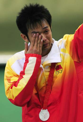 Zhu Qinan of China reacts after winning the silver medal in the men's 10m air rifle shooting competition at the Beijing 2008 Olympic Games August 11, 2008. [Agencies]
