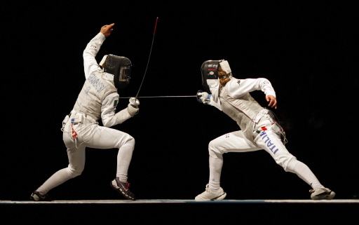 | Italy's Maria Valentina Vezzali (R) hits fellow countrywoman Margherita Granbassi during the women's individual foil semi-final 2 match on August 11, 2008 at the Fencing Hall of National Convention Center, as part of the 2008 Beijing Olympic games. Vezzali won 12-3. [Agencies] |