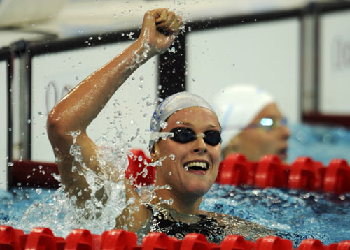 Federica Pellegrini of Italy celebrates setting a world record in her women's 200 meters freestyle heat at the National Aquatics Center during the Beijing 2008 Olympic Games August 11, 2008. [Agencies]