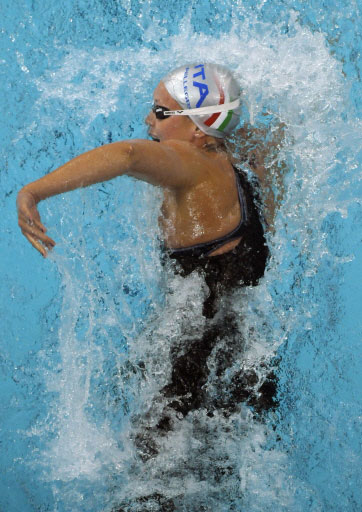 Italy's Federica Pellegrini competes during the women's 400m freestyle swimming heat at the National Aquatics Center at the 2008 Beijing Olympic Games on August 10, 2008 in Beijing. [Agencies]