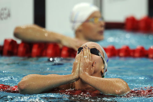 Federica Pellegrini of Italy celebrates setting a world record in her women's 200 meters freestyle heat at the National Aquatics Center during the Beijing 2008 Olympic Games August 11, 2008. [Agencies]