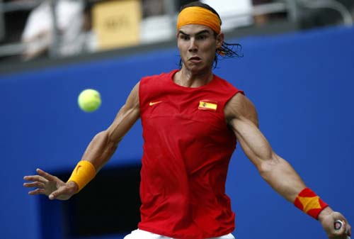 Spain's Rafael Nadal hits a return against Italy's Potito Starace during a men's singles first round tennis match of the 2008 Beijing Olympic Games at the Olympic Green Tennis Centre in Beijing on August 11, 2008. [Agencies]