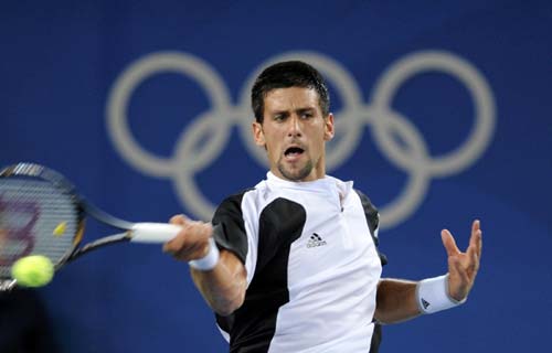 Novak Djokovic of Serbia returns the ball to Robby Ginepri of the U.S. during their men's first round tennis match at the Beijing 2008 Olympic Games August 11, 2008. [Agencies]