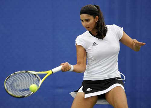 Sania Mirza of India returns the ball to Iveta Benesova of the Czech Republic during their women's first round tennis match at the Beijing 2008 Olympic Games August 11, 2008. [Agencies]