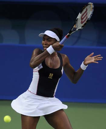 Venus Williams of the U.S. returns the ball to Timea Bacsinszky of Switzerland during their women's first round tennis match at the Beijing 2008 Olympic Games August 11, 2008. [Agencies]