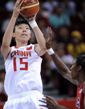China's Chen Nan (L) vies for the ball with Lisa Leslie of the US during their women's preliminary round group B basketball match at the Olympic basketball arena in Beijing on August 11, 2008.[Agencies]