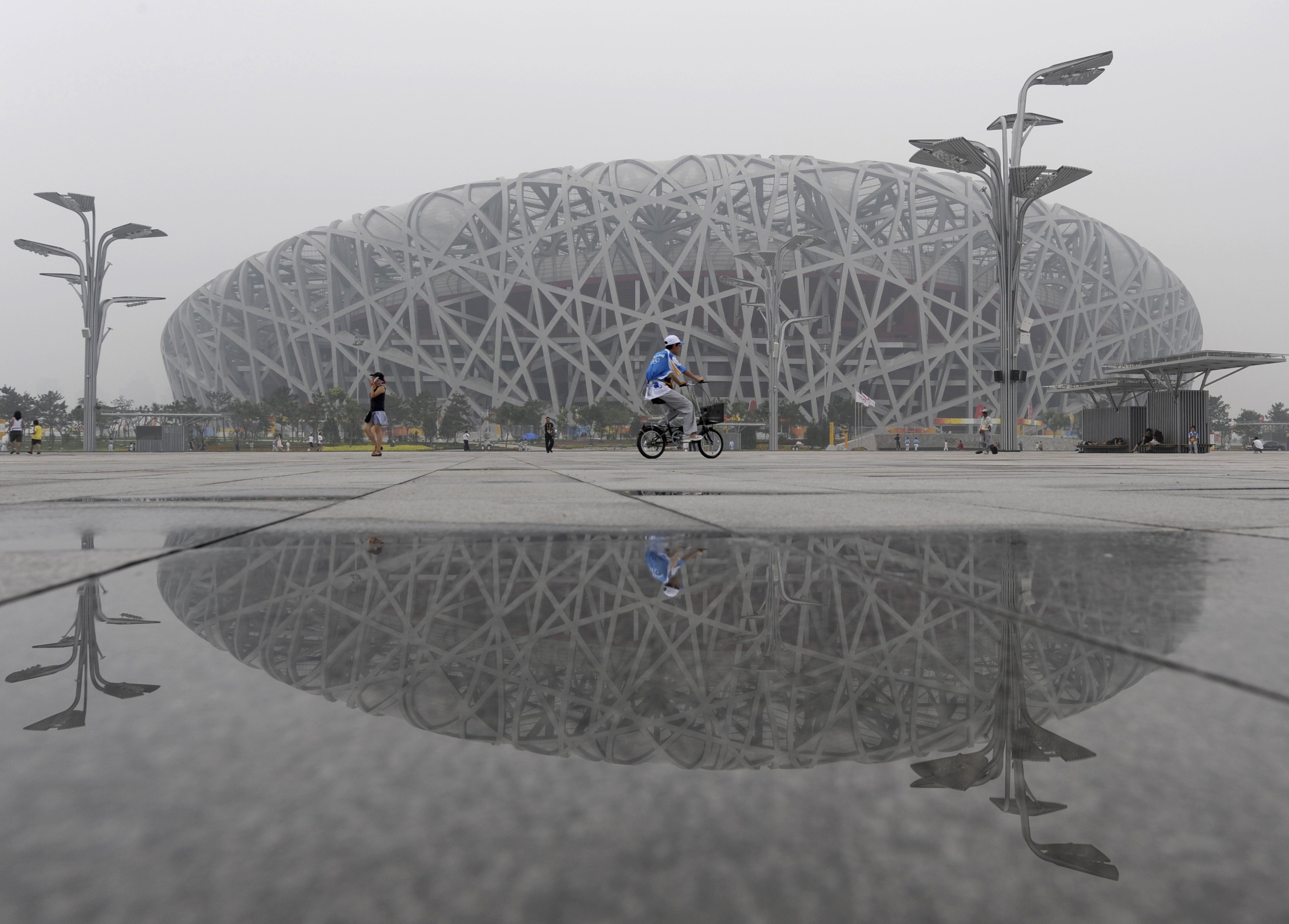 | The National Stadium, also known as the Bird's Nest, is seen reflected after rainfall in Beijing, August 10, 2008. [Agencies] |