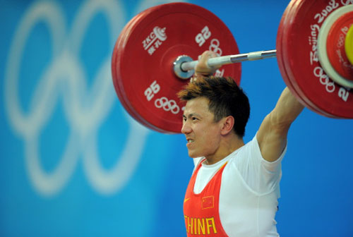 Zhang Xiangxiang of China competes in the men's 62 kg weightlifting event during the 2008 Beijing Olympic Games at the Beijing University of Aeronautics and Astronautics Gymnasium in Beijing on August 11, 2008.[Agencies] Click for more photos