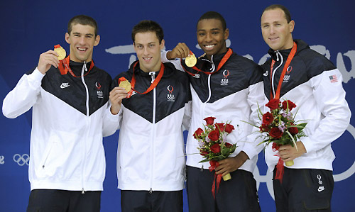 US swimmers Michael Phelps (L), Garrett Weber-Gale (2nd L) Cullen Jones (2nd R) and Jason Lezak stand on the podium after winning the men's 4X100m freestyle relayswimmingfinal at the National Aquatics Center in the 2008 Beijing Olympic Games on August 11, 2008. The US broke the world record in the men's 4x100-metres freestyle relay, winning gold in 3min 08.24 to keep Michael Phelps's dream of eight Olympic gold medals alive. [Agencies]