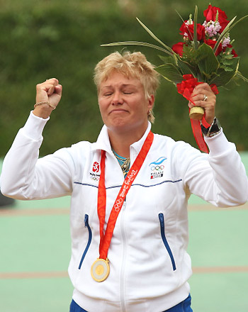 Gold medalist Satu Nummela-Makela of Finland celebrates on the podium after winning the Women's Trapshootingcompetition during the 2008 Beijing Olympic Games on August 11, 2008. [Agencies]