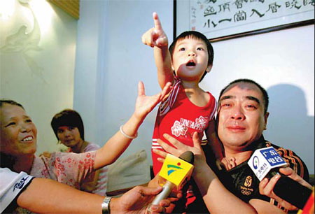 Liu Bo hoists his 2-year-old daughter Liu Jiahui for a clear view of her mom Xian Dongmei winning gold on Sunday August 10 2008. [China Daily]