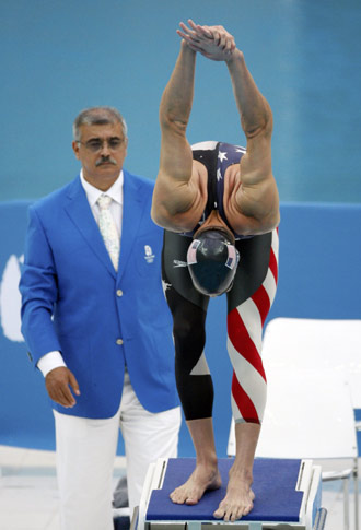Michael Phelps of the U.S. stetches before the men's 200m freestyle swimming final at the National Aquatics Center during the 2008 Beijing Olympics, August 12, 2008. Phelps broke the world record in the men's 200 metres freestyle with a time of one minute 42.96 seconds at the Beijing Olympics. [Agencies]