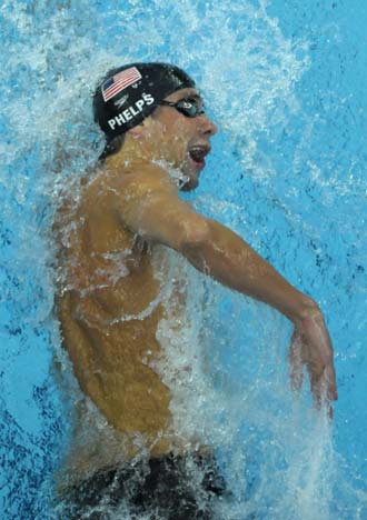 US swimmer Michael Phelps competes in the men's 200m freestyle heat at the Beijing Olympic Games August 11, 2008. Phelps broke the men's 200m freestyle at the final and won his third gold medal Tuesday. [Agencies]