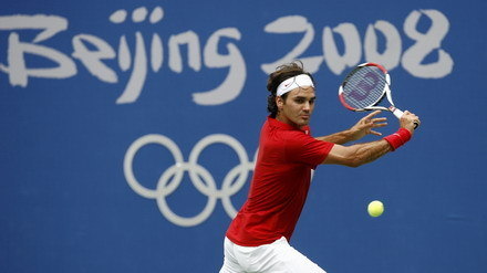 Roger Federer of Switzerland returns the ball to Dmitry Tursunov of Russia during their men's first round tennis match at the Beijing 2008 Olympic Games August 11, 2008. [Agencies]