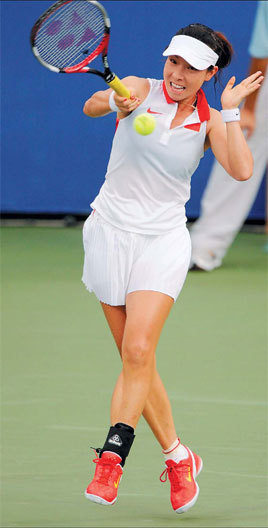 Zheng Jie of China returns the ball to Agnes Szavay of Hungary during their first round match Monday. Zheng won 4-6, 6-3, 7-5. [Agencies]