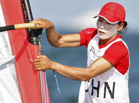 Yin Jian of China competing in the RS:X women's windsurfing class rounds the down windward mark during the second race of the sailing competition at the Beijing 2008 Olympic Games in Qingdao, Shandong province, August 11, 2008. [Agencies]