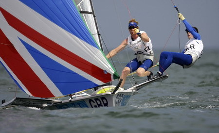 Britain's Stevie Morrison and Ben Rhodes approach the finish line in race two of the 49er class competition at the Beijing 2008 Olympic Games in Qingdao, Shandong province, August 10, 2008. [Agencies]