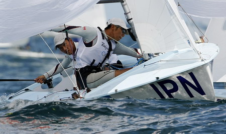 Tetsuya Matsunaga and Taro Ueno of Japan competing in the 470 men's class round the down windward mark during the first race of the sailing competition at the Beijing 2008 Olympic Games in Qingdao, Shandong province, August 11, 2008. [Agencies]