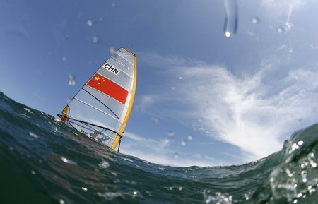 Wang Aichen of China practices before race one of the RS:X men's windsurfing competition at the Beijing 2008 Olympic Games in Qingdao, Shandong province, August 11, 2008.Picture taken with an underwater camera. [Agencies]