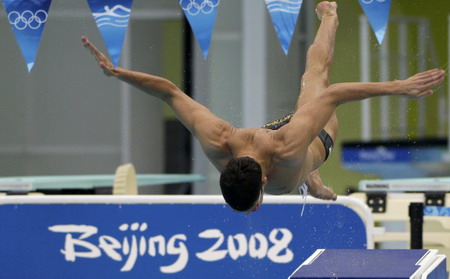 Eamon Sullivan of Australia jumps into the pool during swimming practice at the National Aquatics Centre, also known as the Water Cube, ahead of the Beijing 2008 Olympic Games August 5, 2008. [Agencies]