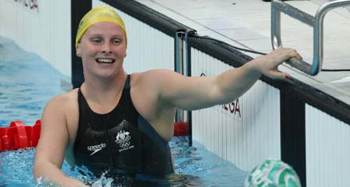 Australia's Leisel Jones celebrates after winning the women's 100m breaststroke swimming semifinal at the National Aquatics Center in the 2008 Beijing Olympic Games on August 11, 2008. Jones won the Olympic gold medal in the women's 100m breaststroke swimming event on Tuesday. [Agencies]