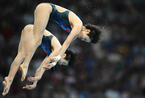 The Chinese team of Wang Xin (R) and Chen Roulin compete in the women's 10m synchronised platform diving finals held at the National Aquatics Center in the 2008 Beijing Olympic Games in Beijing on August 12, 2008. China was first, Australian second and Mexico third. [Agencies]