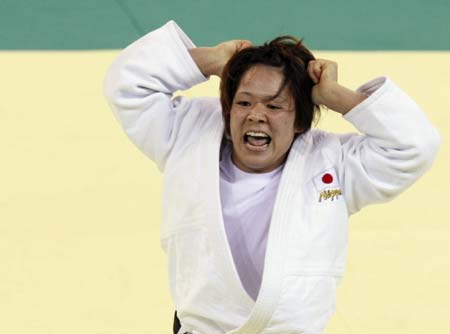 Ayumi Tanimoto of Japan celebrates beating Lucie Decosse of France in the women's -63kg judo final at the Beijing 2008 Olympic Games, August 12, 2008. [Agencies]