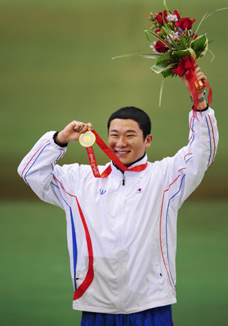 Jin Jong Oh of South Korea celebrates after winning the gold medal in the men's 50m pistol shooting competition at the Beijing 2008 Olympic Games August 12, 2008. [Agencies]