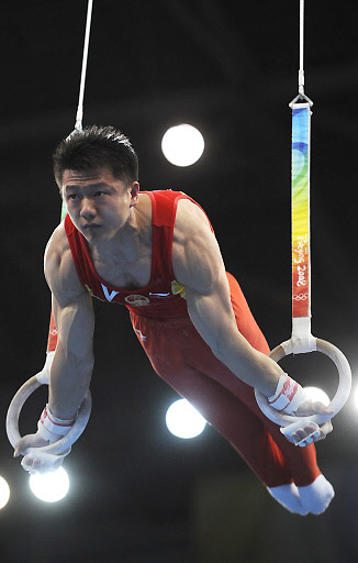 China's Chen Yibing competes on the rings during the men's team final of the artistic gymnastics event of the Beijing 2008 Olympic Games in Beijing on August 12, 2008. [Agencies]