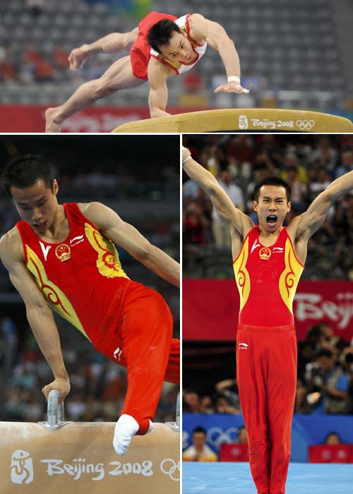 The combo shows Xiao Qin, member of the Chinese men's gymnastics team performs his routines during the men's team artistic gymnastics qualifications and finals at the Beijing 2008 Olympic Games August 12, 2008. China won the gold at the final. [Agencies]