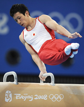 Japan's Koki Sakamoto competes on the pommel horse during the men's team final of the artistic gymnastics event of the Beijing 2008 Olympic Games in Beijing on August 12, 2008. China won the gold, while Japan won the silver and the United States the bronze medal. [Agencies]