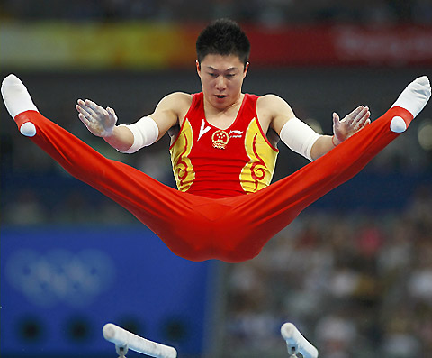 Li Xiaopeng of China competes in the parallel bars of the men's team artistic
