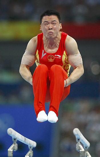 Huang Xu of China competes in the parallel bars of the men's team artistic gymnastics final at the Beijing 2008 Olympic Games August 12, 2008. [Agencies]