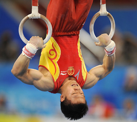 China's Yibing Chen competes on the rings during the men's team final of the artistic gymnastics event of the Beijing 2008 Olympic Games in Beijing on August 12, 2008. [Agencies]