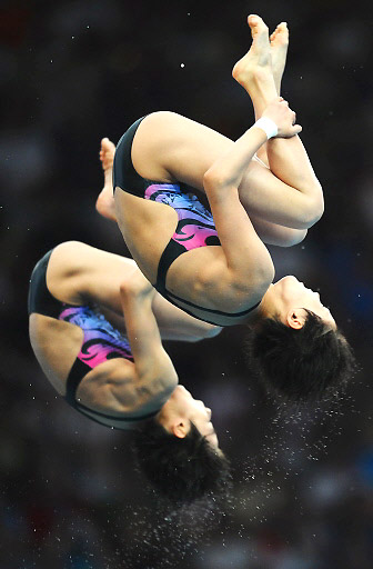 The Chinese team of Wang Xin (R) and Chen Roulin compete in the women's 10m synchronised platformdivingfinals held at the National Aquatics Center in the 2008 Beijing Olympic Games in Beijing on August 12, 2008. China was first, Australian second and Mexico third. [Agencies]