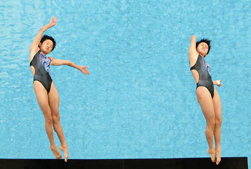 Wang Xin and Chen Ruolin of China compete in the women's synchronised 10m platform diving competition at the National Aquatics Center during the Beijing 2008 Olympic Games August 12, 2008. [Agencies]