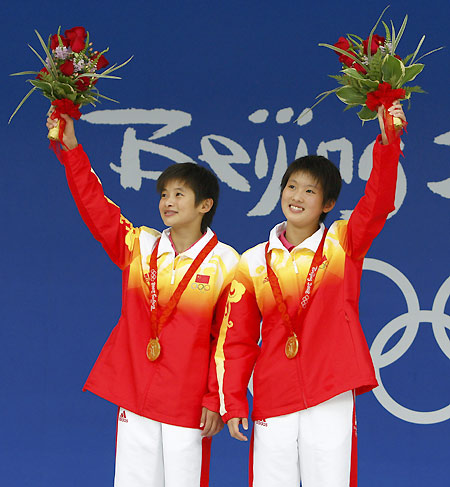 Wang Xin (L) and Chen Ruolin of China pose with their gold medals after winning the women's synchronised 10m platform diving competition at the National Aquatics Center during the Beijing 2008 Olympic Games August 12, 2008. [Agencies]