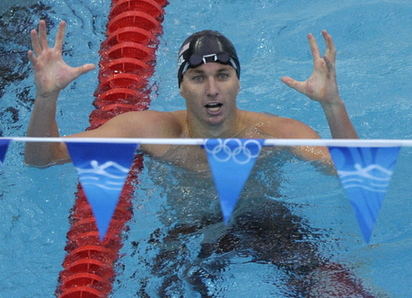 US swimmer Aaron Peirsol celebrates after the men's 100m backstroke swimming final at the National Aquatics Center in the 2008 Beijing Olympic Games on August 12, 2008. [Agencies] more photo
