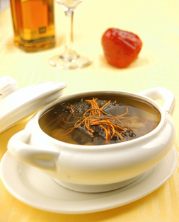 Chongcaohua Liaoshen, a signature dish of China People's Palace Hotel, is ready to be presented to customers. Chongcaohua Liaoshen is made by boiling live Liaoshen, a special kind of sea cucumber growing in China and Japan, together with Chongcaohua, a kind of cultured fungus. [On the Courtesy of China People's Palace Hotel]